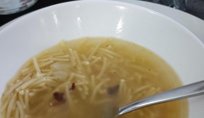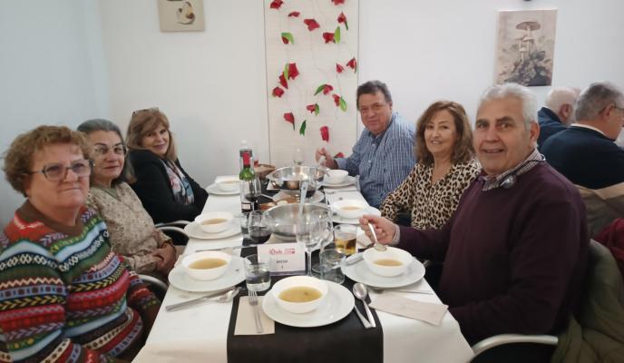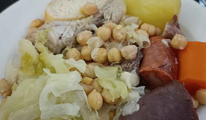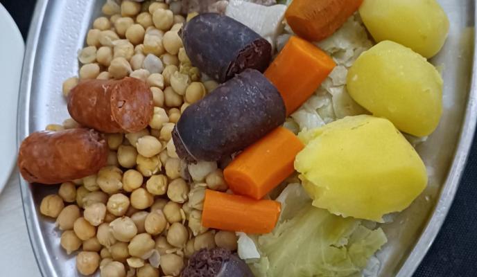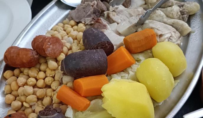 Siguiendo la tradición, la comida comenzó con un exquisito consomé con fideos elaborado con caldo de cocido cocinado a fuego lento, al que le siguió la esperada bandeja compuesta por: garbanzos, patatas, zanahorias y col; en su punto perfecto de cocción, acompañados por una jugosa carne de ternera, pollo, tocino, chorizo y morcilla.
