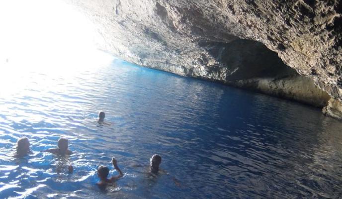 En el itinerario de esta excursión no podía faltar una visita a sa Cova Blava, que ha sido excavada por el mar con el paso del tiempo. Nadar en sus apacibles aguas no tiene precio, pero además llama la atención sus efectos y juegos de luz y color que se producen a media tarde con los rayos de sol que la iluminan.