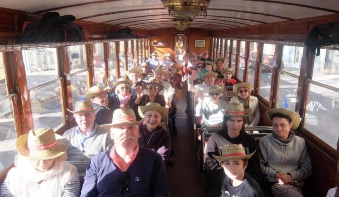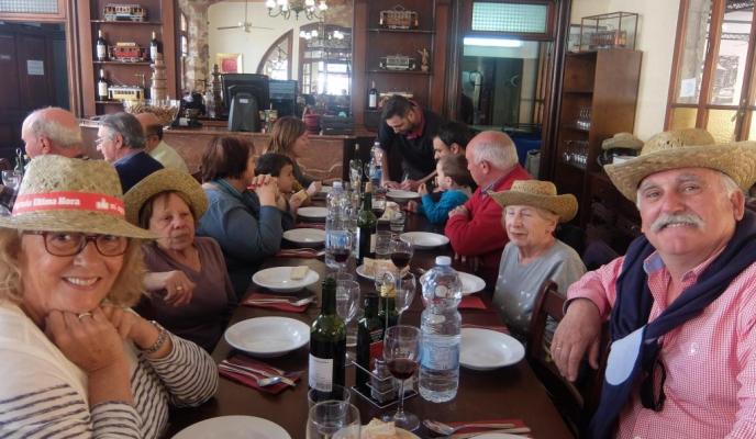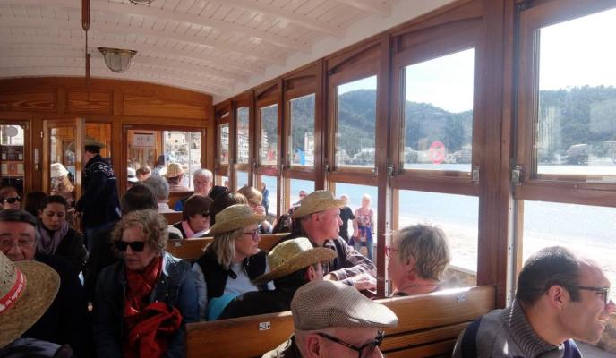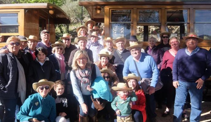 A las diez de la mañana se citaron en la estación de Palma para poner rumbo a Sóller a través de un paseo en tren que les descubriría maravillosos paisajes de la Serra. Una vez en destino, la primera parada fue el Museo Modernista Can Prunera, que pudieron recorrer a su aire sin los agobios y prisas de una visita guiada. Al terminar, las calles de Sóller abrieron un mundo de posibilidades a los excursionistas, que tuvieron tiempo para conocer las entrañas y escondrijos del valle; no pasó desapercibida la espectacular iglesia de su plaza principal. Hubo quien prefirió desplazarse hasta el puerto para visitarlo y concerlo mejor. Hubo tiempo libre que los socios emplearon en aquello que más les apeteció; la única condición era llegar puntual a una comida que tendría lugar en el restaurante Mar y Sol del Port de Sóller. Arròs brut, carne asada con guarnición, postre, café, bebidas y licores compusieron el menú del grupo, que estuvo acompañado por Malena Mas, del Club.