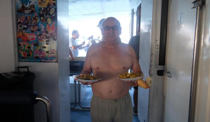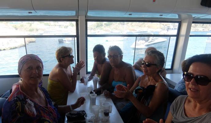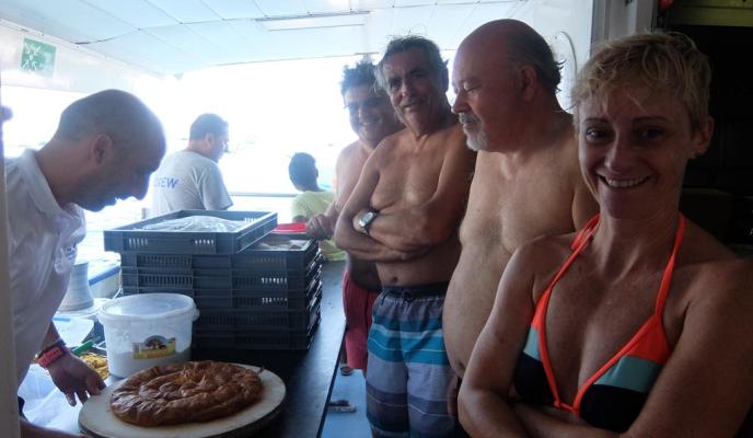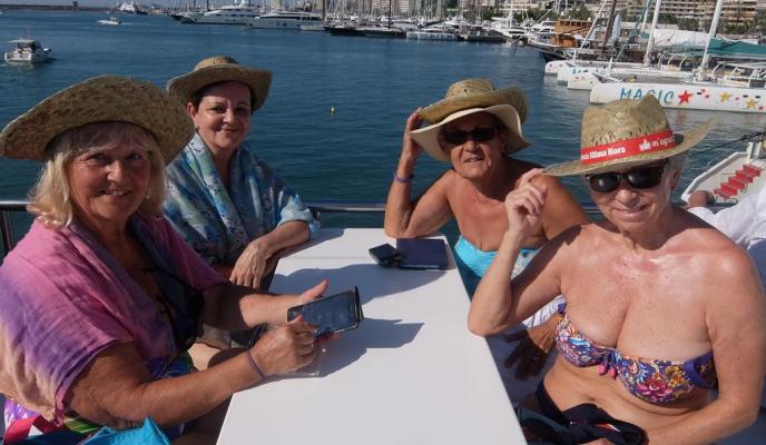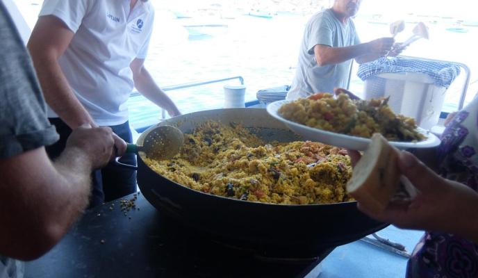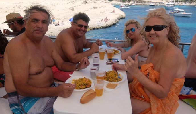 La mañana se pasó rápido para el grupo de amigos del Club que, sobre las 13.30 horas tuvieron que regresar al barco para comer. La compañía de Cruceros Tramontana ofrece, dentro del programa de actividades, el almuerzo; en este caso consistía en una paella, bebida —sangría y agua fresca— y, para el postre, ensaimada y una copa de cava. Todo esto acompañado de música en vivo que los suscriptores disfrutaron durante todo el recorrido en barco.