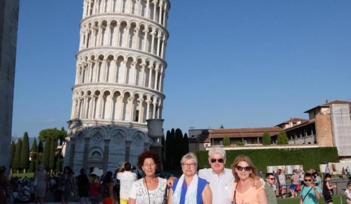 Al poco de tomar tierra en Malpensa, el grupo fue acomodado en el autocar que les esperaba en los aledaños del aeropuerto. Allí, Joan Medina, guía de Dream Tours, fue adelantándoles los lugares que visitarían durante su estancia. La primera parada les llevó a la célebre ciudad de Pisa, donde visitaron el Campo de los Milagros, con su imponente catedral, el Baptisterio y la asombrosamente torcida Torre Inclinada, reclamo turístico por excelencia de la ciudad. A continuación, se desplazaron hasta Montecatini Terme, donde pudieron reponer fuerzas.