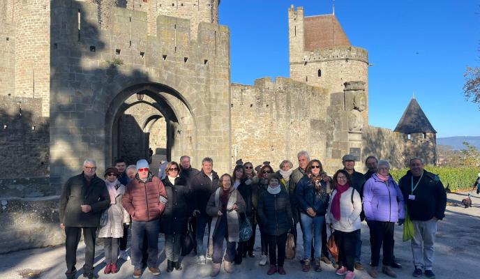 El domingo por la mañana el grupo visitó la ciudad medieval de Carcassonne. Exploraron el centro, que queda rodeado por las murallas de la denominada Cité; también tuvieron la oportunidad de visitar la antigua Catedral, el castillo y sus callejuelas medievales; un recorrido que les trasladó en el tiempo al corazón de la Edad Media. Tras un muy celebrado almuerzo -con el pato como protagonista- en el restaurante Le Chaudron, situado en pleno centro de la Cité, se desplazaron hasta Narbonne, ciudad fundada en el 118 a.C. que se convirtió en la primera colonia romana en la Galia, fuera de Italia. Además de sus canales, entre sus principales atractivos destacan la catedral gótica de San Justo, el Palacio de los Arzobispos y el Horreum romano. La visita finalizó con tiempo libre para pasear por los puestos navideños instalados en el centro de la ciudad, junto a atracciones para todas las edades.
